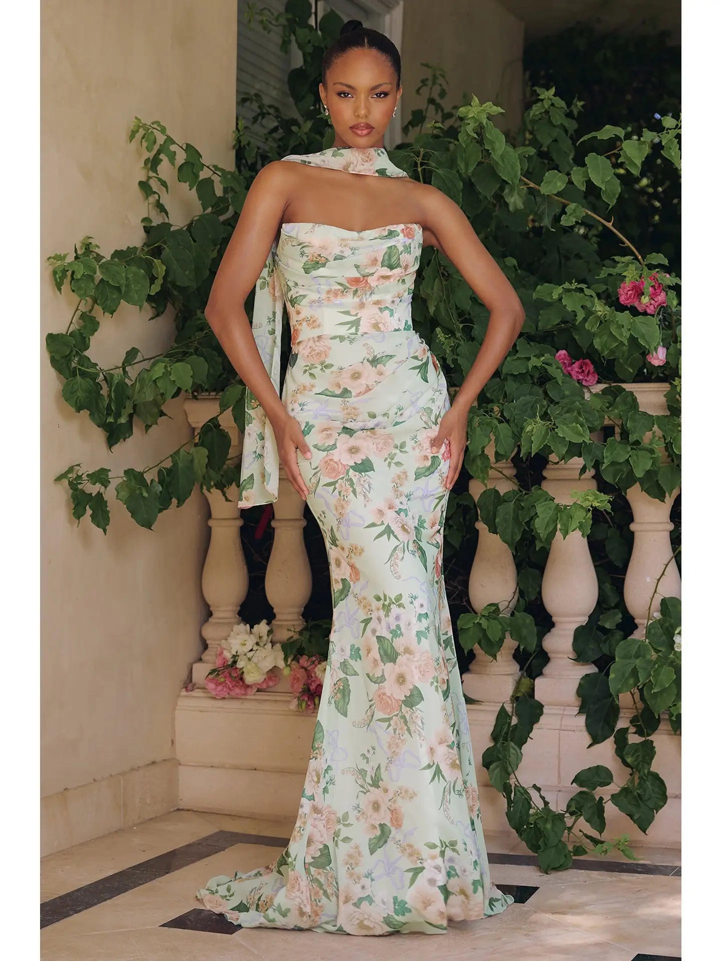As if the flowers themselves conspired to dress you — this extraordinary floral mermaid gown is the definition of effortless grandeur. Soft mint and blush botanicals cascade from a dramatic strapless bodice, flowing into a sweeping train that commands every garden path, every terrace, every moment.