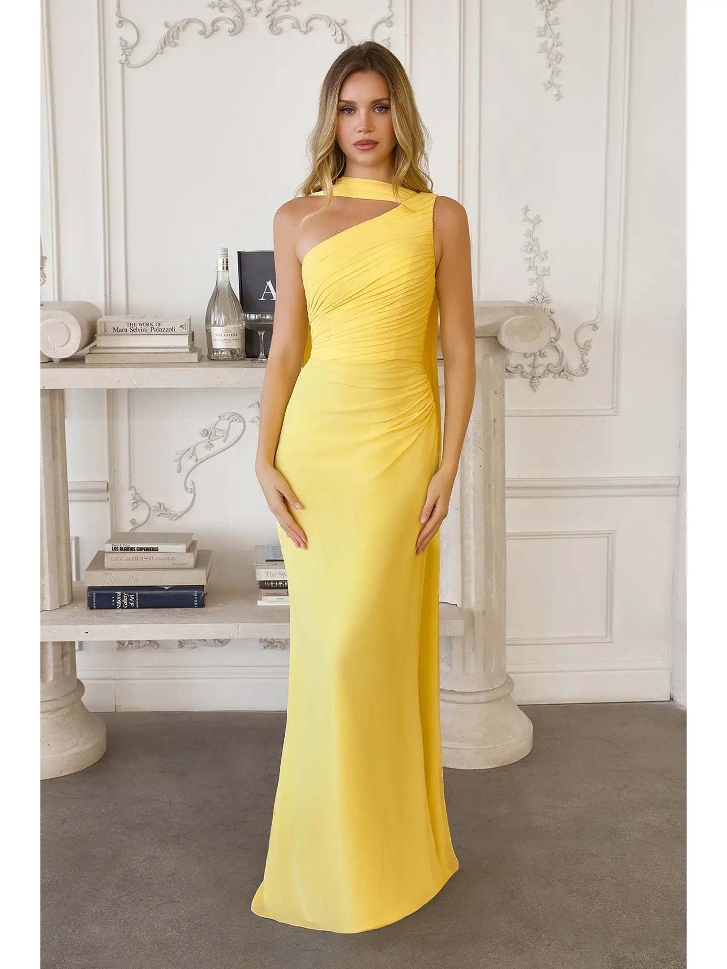 The signature draped scarf detail — swept elegantly over one shoulder — elevates this piece from beautiful to utterly unforgettable.